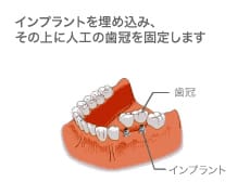 インプラント(人工歯根)は、失った歯の代わりに顎の骨に人工歯根を埋め込み、その上に人工歯を取り付ける治療法です。