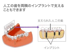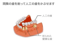 抜けた歯の両隣の歯を削って、抜けた歯と一緒に人工の歯をかぶせます。